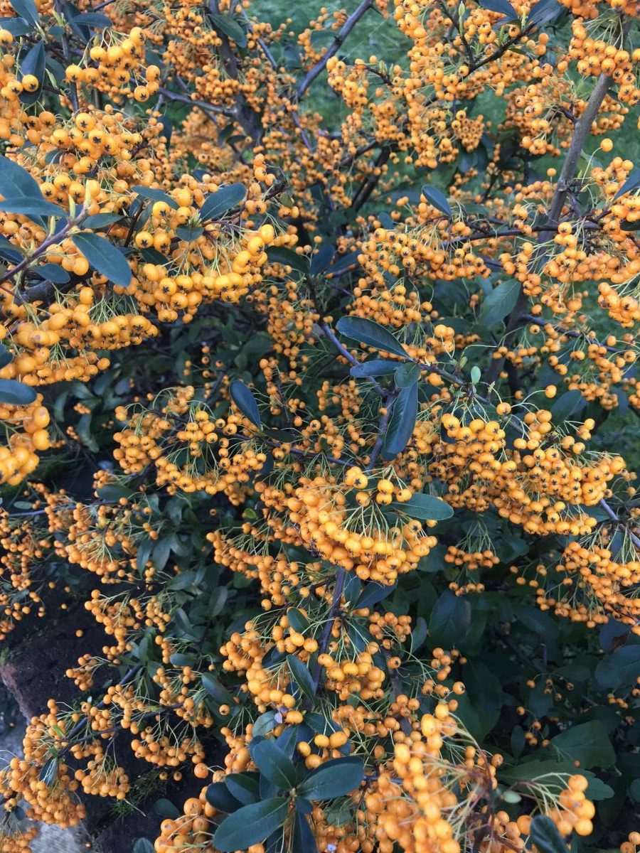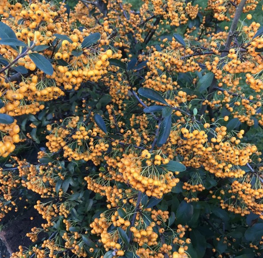 If you’re lucky, birds won’t have eaten all of the berries off of your Pyracantha shrub. Cultivars are available with red or orange berries, above is ‘Orange Glow’.