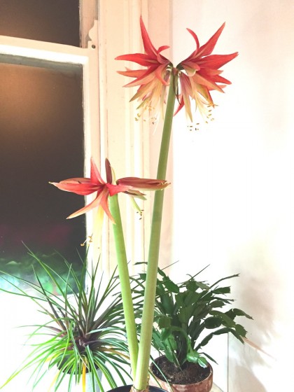 Arriving home to a droopy Hippeastrum. Must remember to stake it if I get it to flower again!