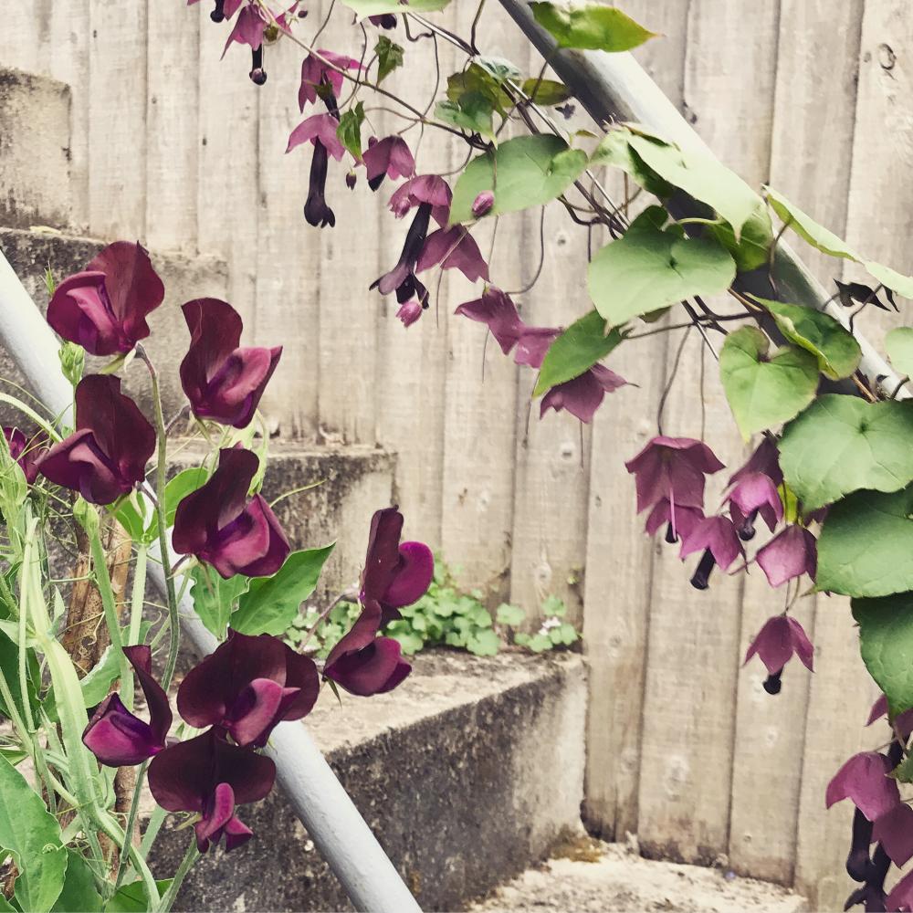 One of our Rhodochiton atrosanguineus overwintered fine outside allowing it to reach three meters already and the season has only just begun, resulting in this fab combo with Lathyrus odoratus ‘Almost Black’. With some judicious deadheading and good feeding I’m hoping to keep this pair going until the frosts.
